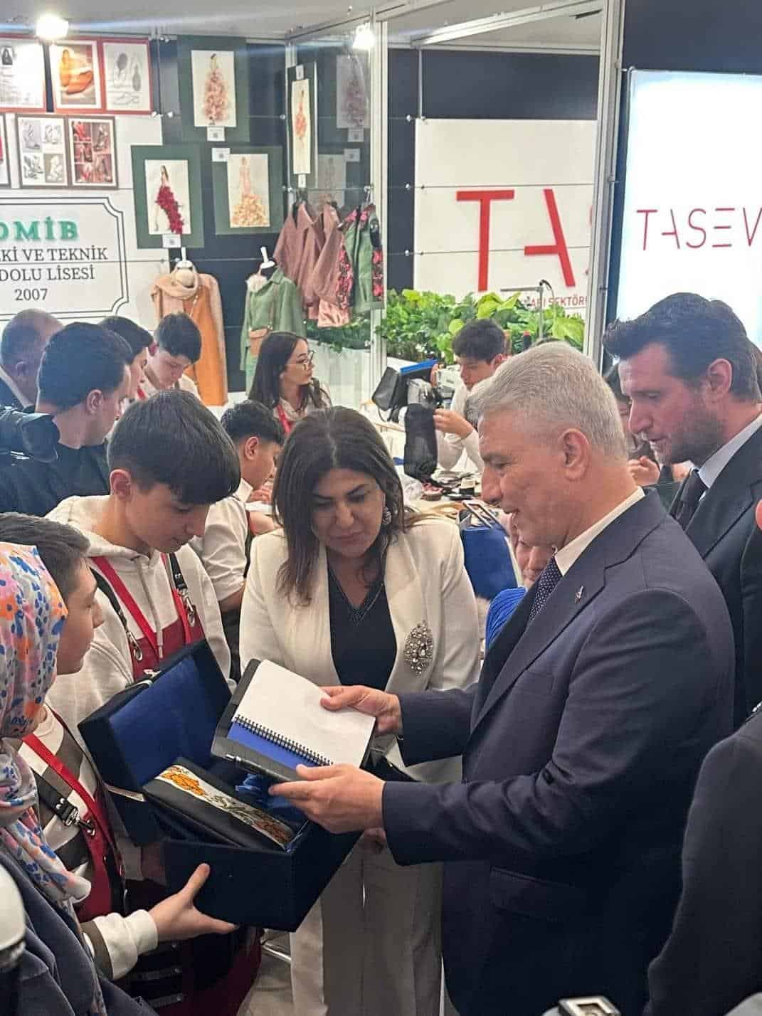 Fuarın en anlamlı anlarından biri ise, öğrencilerin el emeğiyle ürettiği nadide çanta ve ajandanın Sanayi ve Ticaret Bakanı Sayın Ömer Bolat'a takdim edilmesiydi. Bu anlamlı buluşma, geçmişin doğru işlendiğinde geleceğin en güçlü tasarımını oluşturabileceği mesajını verdi.